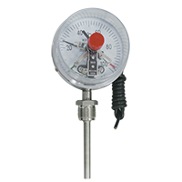 WSSX系列电接点双金属温度计带有电接触装置一即机械电接点。当被测介质温度变化时,自由端上的细轴及转向传动机构带动指针及动触点转动,在标度盘上指示出温度的变化值,当其与定触点(上、下限定触点)接触或断开时的瞬时,使电路系统中的继电器及接触器动作,以达到自动控制和报警目的,应符合JB/T8803 1998标。