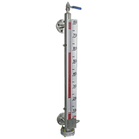 液位计根据浮力原理和磁性耦合作用研制而成。当被测容器中的液位升降时,液位计主导管中的浮子也随之升降,浮子内的永久磁钢通过磁耦合传递到现场指示器,驱动红、白翻柱翻转180º,当液位上升时,翻柱由白色转为红色,当液位下降时,翻柱由红色转为白色,指示器的红、白界位处为容器内介质液位的实际高度,从而实现液位的指示。
